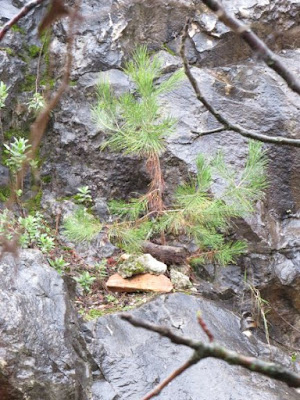 Do rochedo nasceu um pinheirinho. Ficámos intrigados. De onde lhe vem o sustento? Pensámos que não tem como sobreviver, sem terra. Mas não tivemos coragem para interromper a sua ousadia.